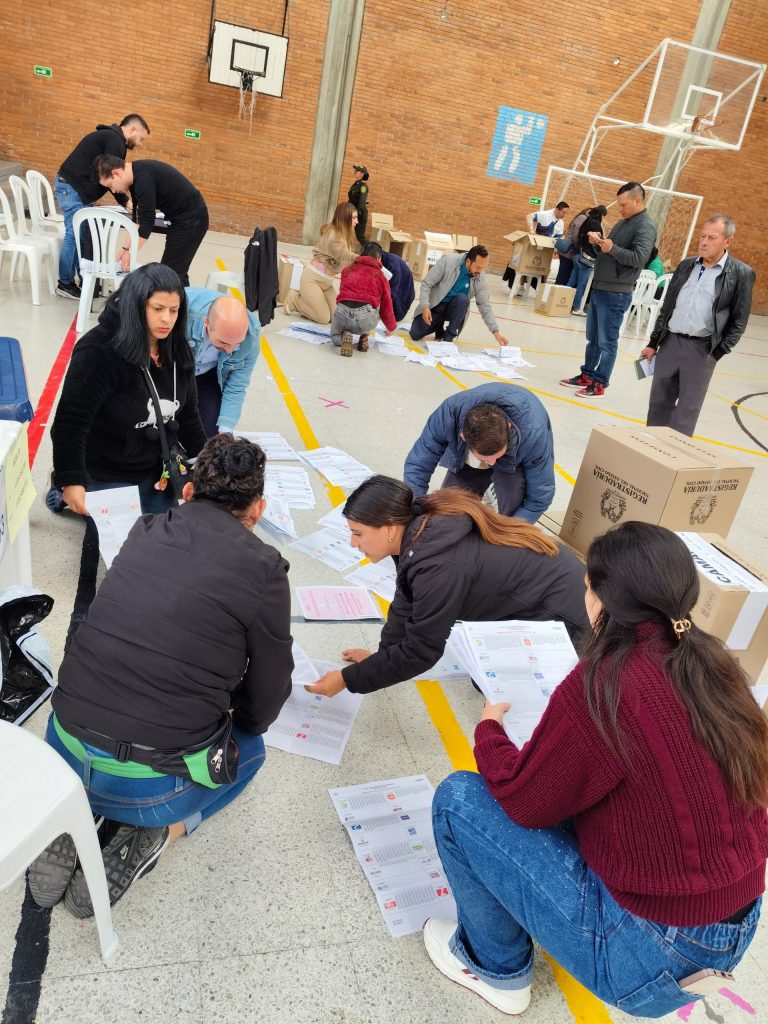 Los resultados y sus análisis, corresponden a otras notas (*). Nosotras constatamos una normalidad en el propio día electoral (lo que siempre es habitual en “ese día”, en que incluso hay “alto el fuego” por parte de varios grupos armados), mucha gente joven en las mesas (de 6 jurados cada una), presencia de muchas personas funcionarias de las “ías”, Procuradoría, Registraduría, Polícía, Defensoría… que alivian un poco la complejidad de los tarjetones (grandes) con los que tienen que lidiar los votantes.