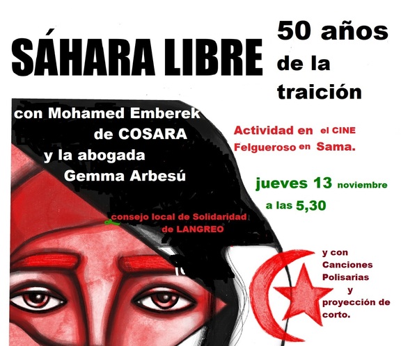 También del Sahara se ha recordado que este viernes 14 se cumplen los 50 años de la traición franquista, y hay concentraciones y manifestación en Madrid, con autobuses que salen de Asturias para ello. Mañana jueves en el Cine Felgueroso de Langreo se hablará del Sahara, con el presidente de COSARA y con la abogada Gemma Arbesú, del Observatorio asturiano de DDHH para el Sahara Occidental.