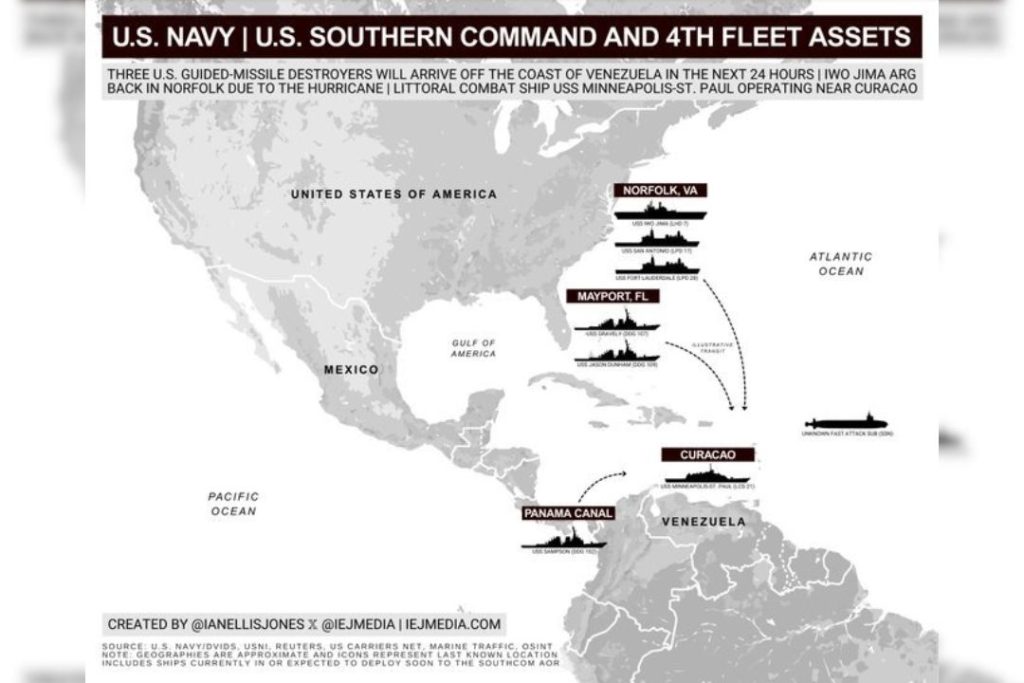 El despliegue por Trump de tropas, portaviones y fragatas amenazando a Venezuela y a Colombia, constituyen acciones ilegales, como las ejecuciones extrajudiciales de 70 personas en el mar a misilazo limpio, son acciones ilegales, injustas y constituyen crímenes de lesa humanidad.