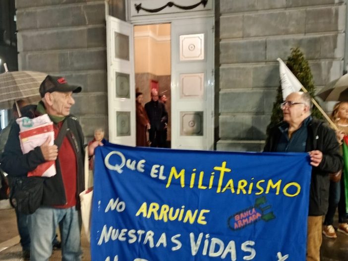 «Antes de comenzar con la lectura del texto de esta concentración, es obligado dedicar a modo de homenaje unas palabras a dos personas que nos han dejado recientemente y cuya implicación en el movimiento pacifista y en tantas luchas sociales ha sido fundamental. En primer lugar, a Mercedes, una persona profundamente comprometida con el antibelicismo, quien nos acompañó en la formación de esta plataforma tan necesaria. Y en segundo lugar, a Tino Brugos, fundador de XEGA, del Comité de Solidaridad con América Latina, sindicalista de SUATEA y militante de tantísimos movimientos sociales. A ambos les dedicamos esta concentración, les dedicamos estas palabras, les dedicamos esta lucha compartida. Que la tierra os sea leve, compañeros.
