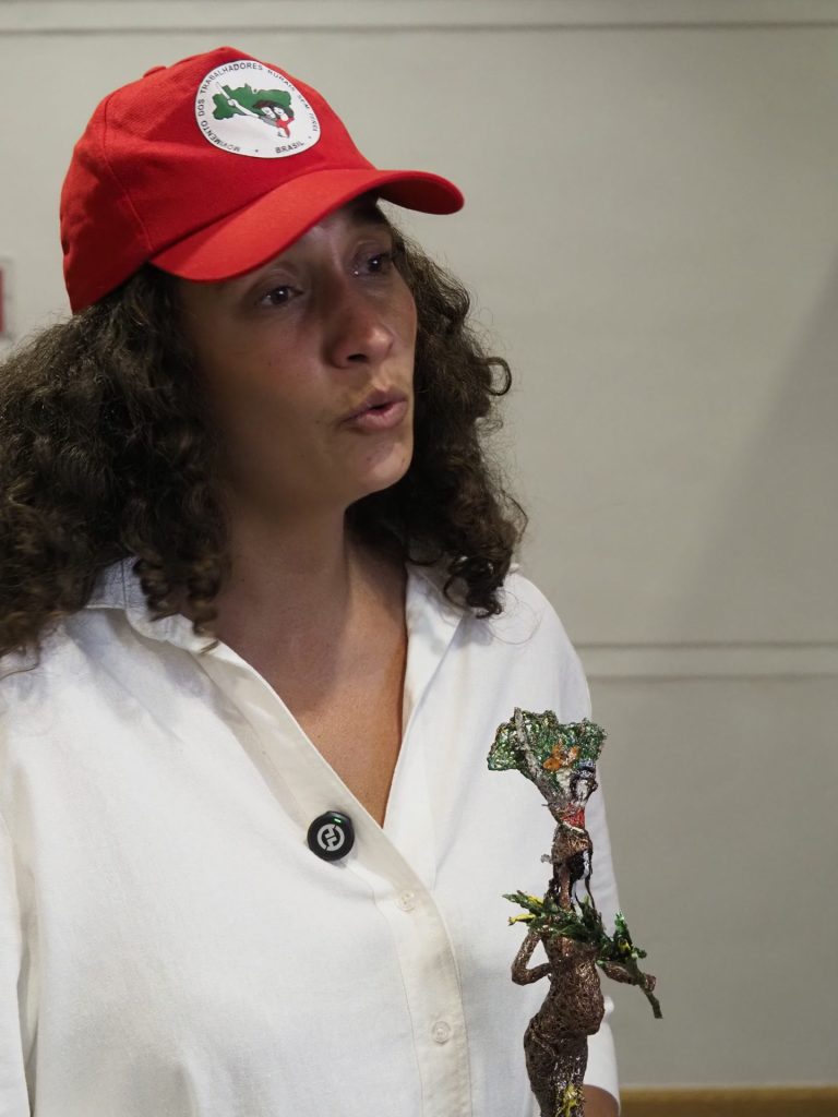 La representación del MST en la ceremonia estuvo a cargo de Kallen Oliveira, militante del Movimiento y coordinadora del Plan Nacional de plantación de Árboles-Alimentos Saludables. Su presencia en el escenario de Zaragoza llevó el peso simbólico de una organización que reúne a más de 450 mil familias asentadas en Brasil y que apuesta por la construcción de su base política, la centralidad de las mujeres y la juventud.