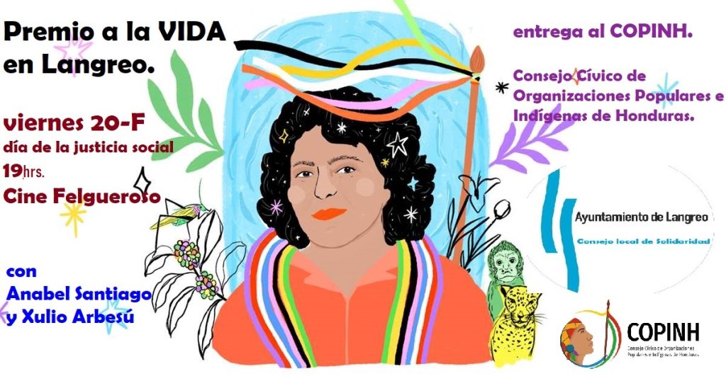 Berta y una docena de integrantes del COPINH han sido asesinadas en la defensa de los territorios indígenas, de los ríos, de la Vida. Y el Premio a la Vida de Langreo, que se entregará el «día de la justicia social» en el municipalizado Cine Felgueroso, sin duda contribuirá a esa defensa consecuente de la Vida, en el que el COPINH ha dedicado sus mejores energías organizativas.